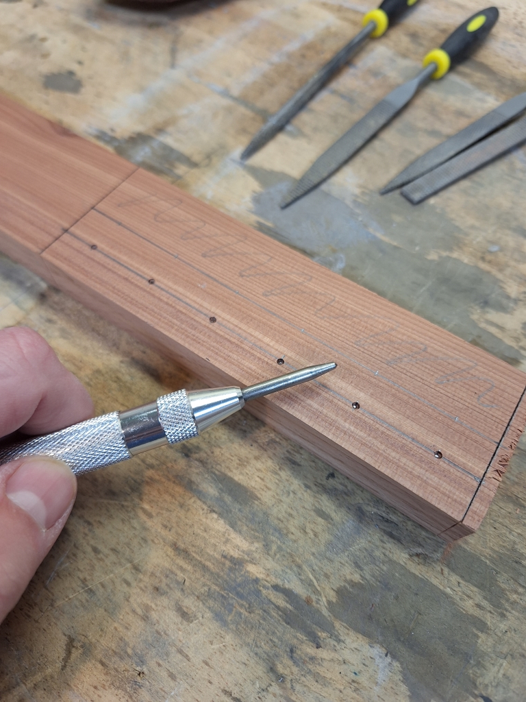 I’ve got a nice cedar off cut that I will cut down once it’s not 0f outside. In the meantime, I’ve measured out my spaces and punched them for drilling.