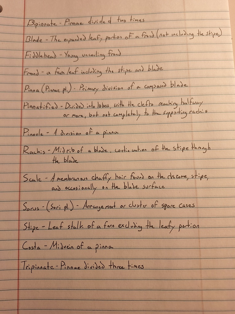 above is a (very) partial glossary of fern anatomy with a focus on identifying features. being able to identify parts in the field will help me avoid taking 10,000 pictures of the same ferns. It will also save me from having to sift through those same pictures at a later date when I select which ones to sketch.